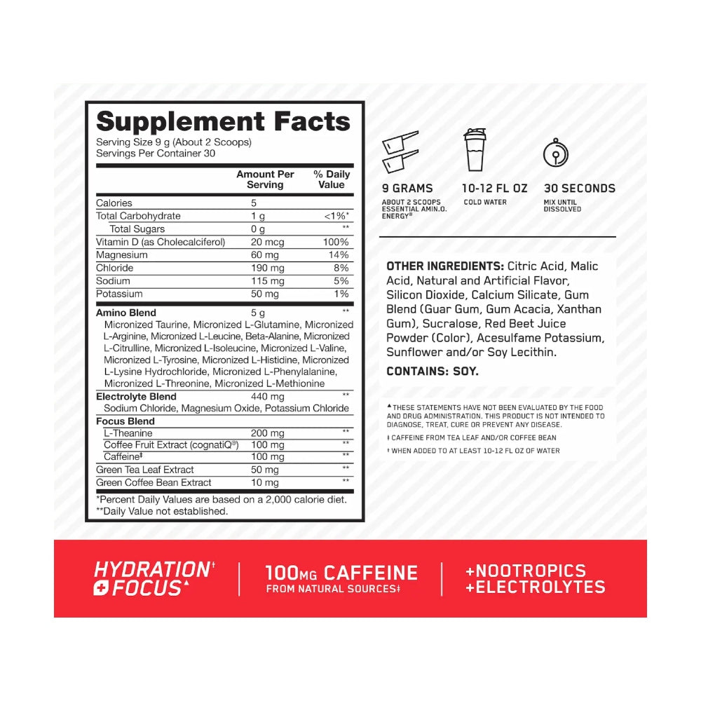 Amino Energy Hydration de Optimum Nutrition, una bebida multifuncional diseñada para quienes buscan energía constante, enfoque mental y una hidratación efectiva. Su fórmula combina ingredientes naturales.