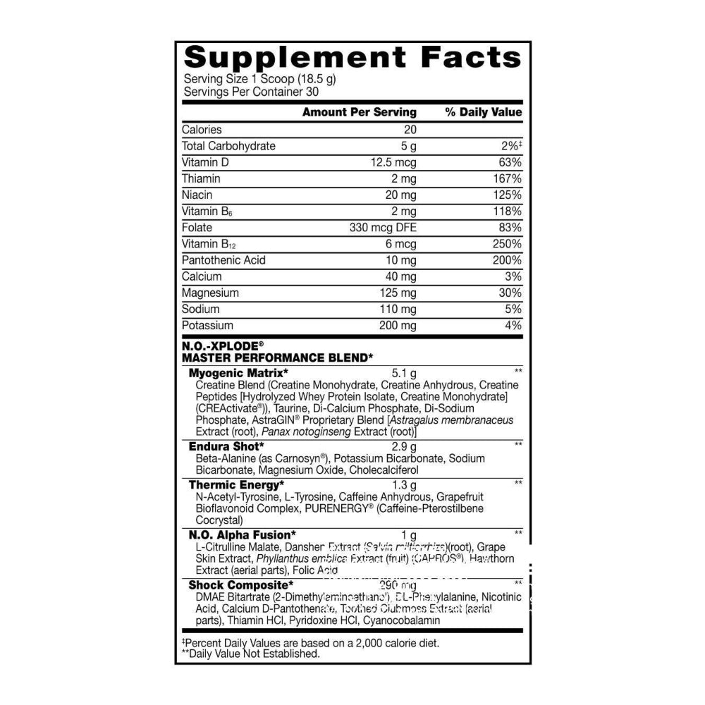 Ingredientes: Mezcla de creatina (monohidrato de creatina, creatina anhidra), taurina, fosfato, dicalcio, fosfato disodico, astragin, (extracto de astragalus, membranaceus (raiz), panax extracto de notoginseng (raiz), CarnoSyn Beta-alanina, bocarbonato de potasio, sodio bicarbonato, óxido de magnesio, colecalciferol, N- acetil, l-tirosina,cafeína anhidra, complejo de bioflanoides de pomeio, Purenergy (cafína, pterostilbeno,cocristalino), L - citrulina malato,extracto de Danshen (salvia miltiorhiza)(raiz), uva extracto de piel, extracto de phyllantus, emblica (fruta), (capros). Extracto de espino (partes aereas, ácido folico, ácido malico (acidulante) silicato de calcio (conservante, dioxido de silicio (anticompactante), sucarolosa (edulcorante), juego de remolacha en polvo (colorante), sal.