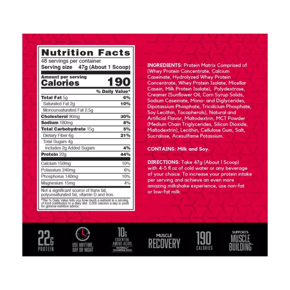 Ingredientes: Matriz de proteína compuesta por concentrado de proteina suero,caseinato de calcio,concentrado de proteina de suero hidrolizada, aislado de proteina de suero, caseina micelar, aislado de proteina de leche) polidextrosa, crema (aceite de girasol, sólidos de jarabe de maiz, caseinato de sodio, mono.y dicliceridos, fosfato dipotásico, fosfato tricálcico, lecitina de soya,tocoferoles), sabor natural y artifial maltrodextrina, polvo MCT ( trigliceridos de cadena medi, doxido de silicio, maltodextrina) lecitina, goma de celulosa, sal, sucralosa, acesulfame de potasio.