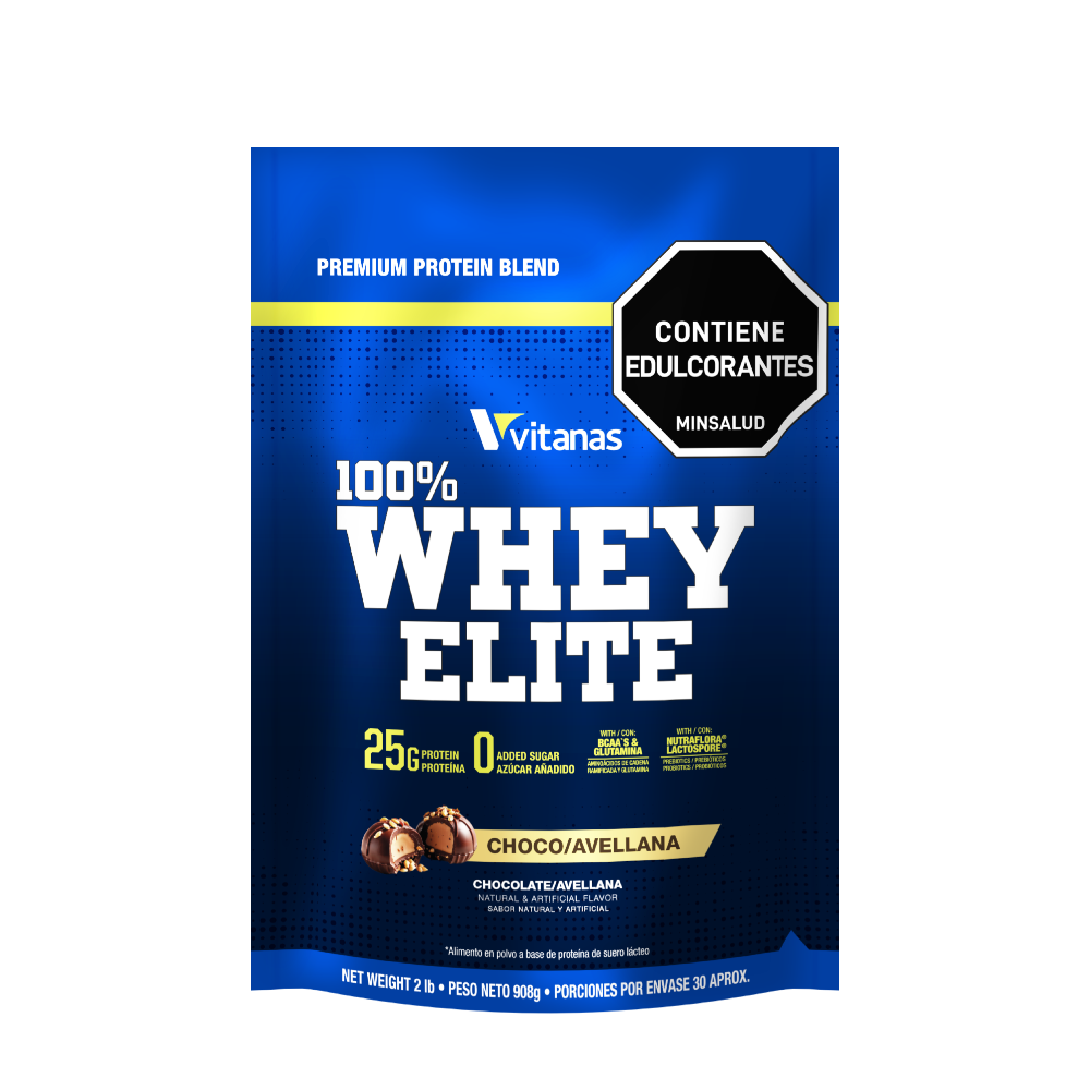 100% WHEY ELITE es una combinación de proteínas del concentrado y aislado de suero lácteo, Aporta 25 gr de proteína, 0 azucares añadidos, baja en carbohidratos y grasas. Contiene BCAAs (Aminoácidos de cadena ramificada (L-leucina, L-valina, L-isoleucina), glutamina, probióticos, prebióticos y enzima digestiva (Lactasa).