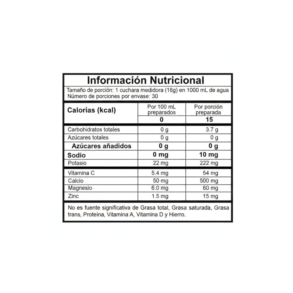 Ingredientes: Polvo Deshidratado de Frutos Amarillos, L-Glutamina, L-Leucina, L-Isoleucina, L- Valina, L-Lisina, L-Treonina, L-Histidina, L-Fenilalanina, L-Metionina, L-Triptófano, Carboximetilcelulosa (CMC), Fosfato Tricálcico, Saborizante Idéntico al Natural, Vitamina C (Ácido Ascórbico), Stevia, Citrato de Sodio, Citrato de Potasio, Ácido Málico, Dióxido de Silicio, Colorante (Amarillo), Citrato de Magnesio, Gluconato de Zinc.